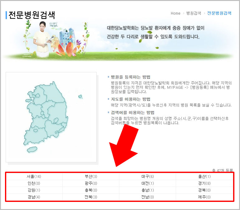 사이트로 접속하면 아래 전국 지역별 당뇨발 전문 병원 지점들이 나옵니다.