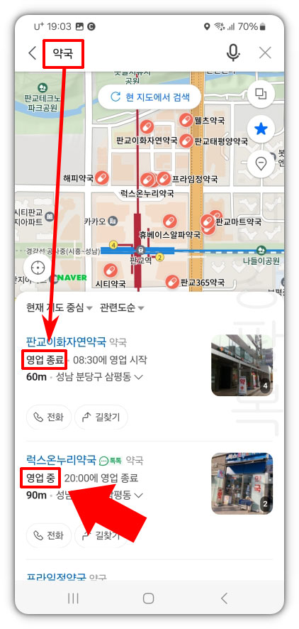 3. 약국을 검색하면 약국 밑에 영업 종료, 영업 중이라고 표시가 됩니다. 명절이나 휴일에 영업 중인 약국을 클릭해서 찾아가시면 됩니다.