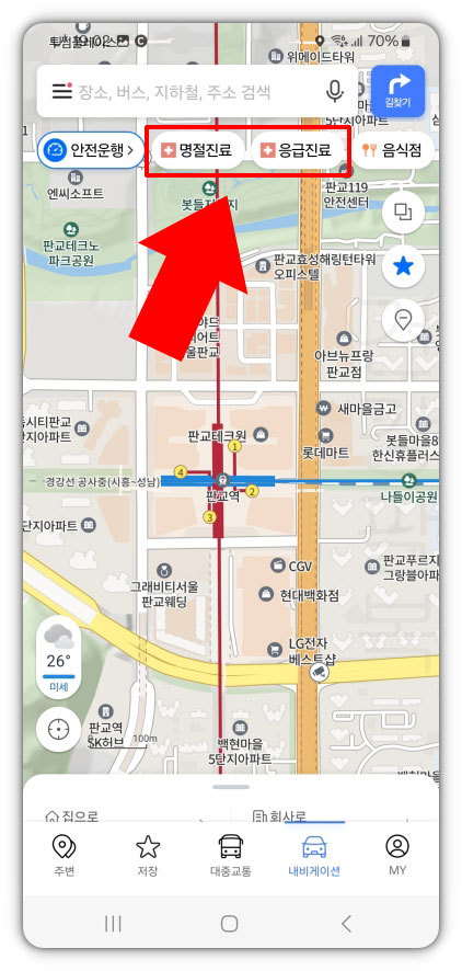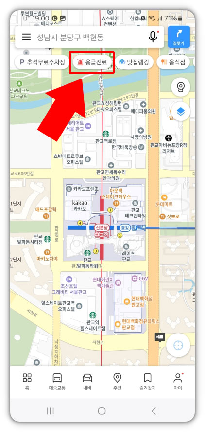 2. 카카오맵 상단에 응급진료 버튼이 있습니다. 명절이나 주말에 급하게 병원 진료가 필요할 때 검색하실 수 있습니다.
