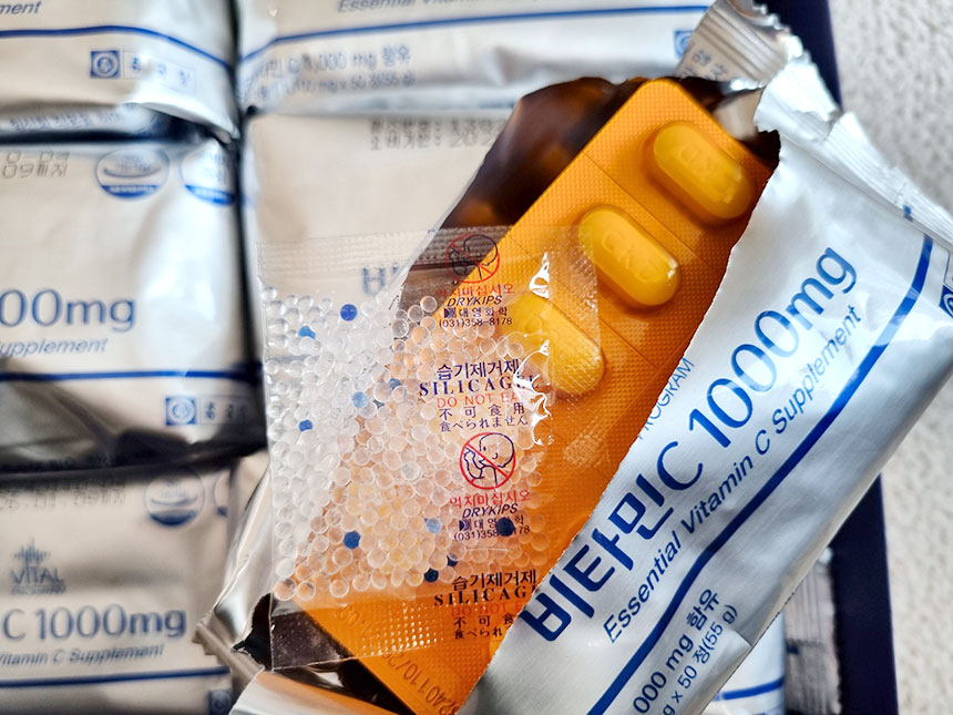 개별 봉지를 까보면 안에 습기제거제가 같이 들어 있습니다. PTP 포장 기본적으로 밀폐되어 있지만 습기제거제를 또 한 번 넣어 놓았습니다.